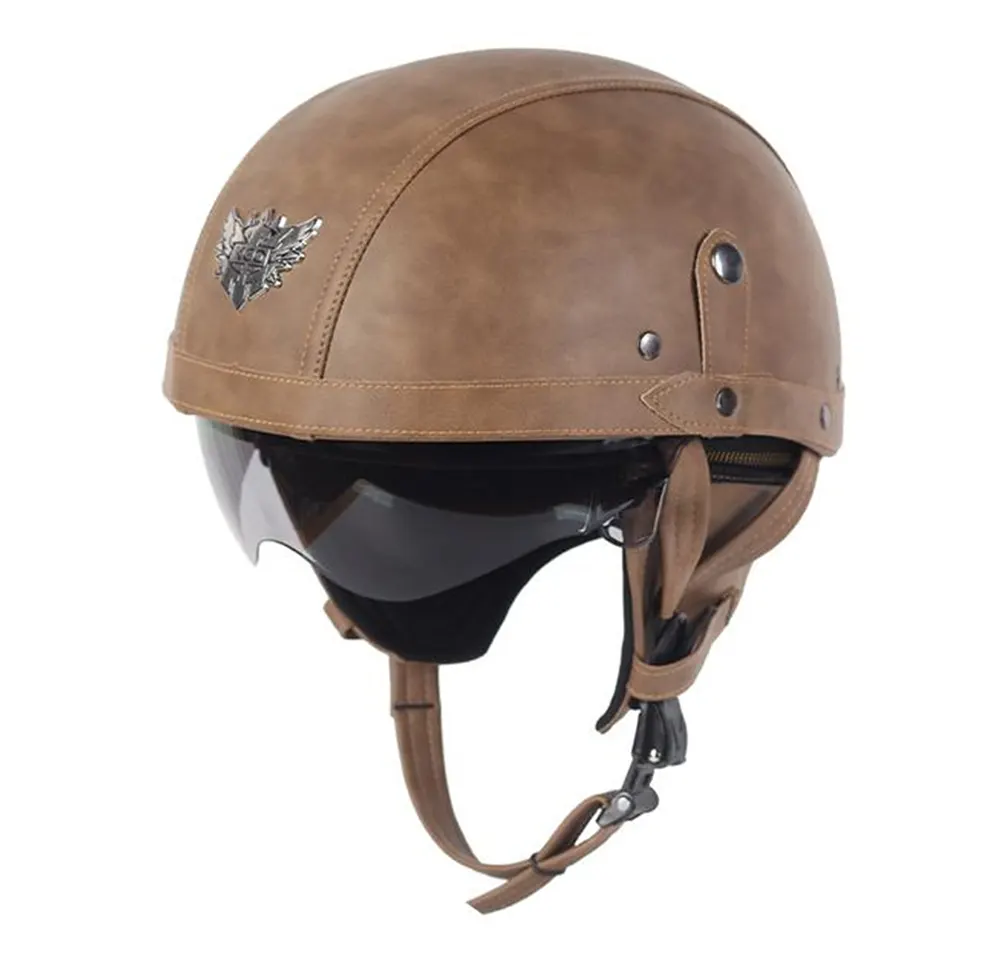 Capacete meia face para motocicleta em couro com óculos