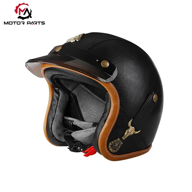 Em termos de segurança, nosso capacete de couro para capacete de meia face para motocicleta com óculos foi projetado de acordo com os principais padrões de segurança para capacetes de motocicleta, apresentando uma estrutura confiável de absorção de impacto que pode dispersar efetivamente as forças de impacto em velocidades normais de condução.