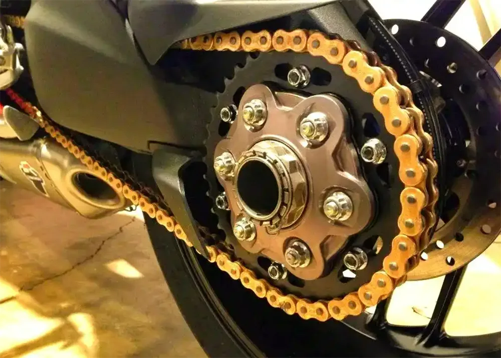 Entre os esquemas de transmissão de potência de muitas motocicletas, o sistema de transmissão por corrente e roda dentada tornou-se a escolha preferida para muitas motocicletas devido às características simples e eficientes. Possui alta eficiência de transmissão e peso leve, especialmente adequado para tipos de veículos que exigem alto torque. No entanto, também apresenta certas limitações, como desgaste e ruído durante a operação. Durante o processo de transmissão da potência do motor para as rodas traseiras, a amplificação do torque e o ajuste da relação de redução podem ser alcançados ajustando a relação dos dentes das engrenagens dianteiras e traseiras.