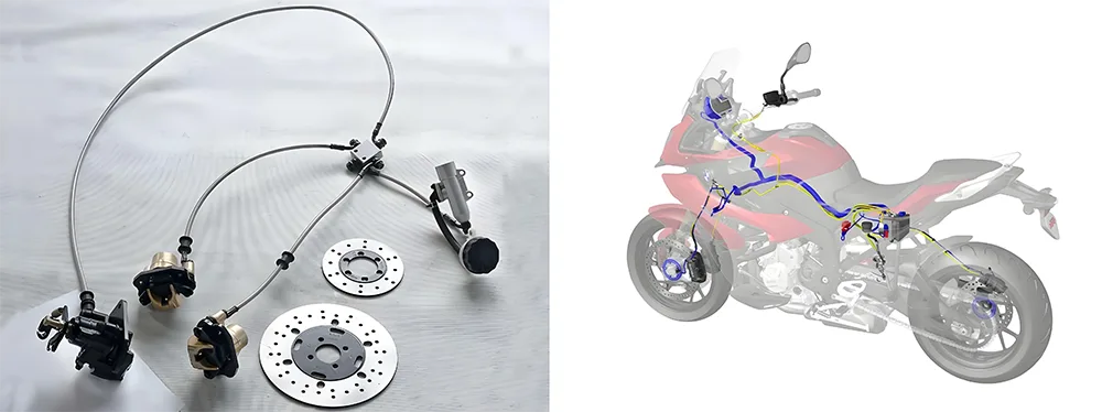 É assim que você gerencia diretamente sua bicicleta – tudo o que você segura para dirigi-la e pará-la. Na frente, você tem a haste de direção e o guidão (ou 'barras') - onde você segura e dirige o pneu dianteiro. Depois, há as alavancas de controle: a alavanca do freio (dianteiro) e a alavanca da embreagem (mão esquerda), além do pedal do freio (pé direito, geralmente para o pneu traseiro). Cabos e conexões transmitem seus movimentos, enquanto a verdadeira capacidade de parada vem da configuração do freio - pinças apertando os rotores do freio (ou tambores em algumas bicicletas antigas). E o ABS (Sistema de Frenagem Antibloqueio), aquele recurso de segurança vital que impede o travamento das rodas quando você realmente precisa desacelerar rapidamente. Se você agarrá-lo, pisar nele ou se apoiar nele para controlar a bicicleta, isso faz parte dessa configuração.
